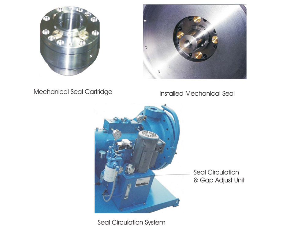 MULTISHEAR DISK ATTRITION MILLS and SUPER BLENDERS utilize double mechanical seals that are housed in a stainless steel seal cartridge that is easily removed and replaced. The seal cartridge also holds the shaft thrust bearing in place as a means of minimizing shaft length and overhang. The resulting configuration is extremely rigid with virtually no shaft deflection or run out that typically plagues other size reduction equipment. In addition, the MULTISHEAR equipment is furnished with a seal circulation system which circulates, filters, pressurizes, and cools the seal barrier fluid to provide ideal conditions for an extended seal life.